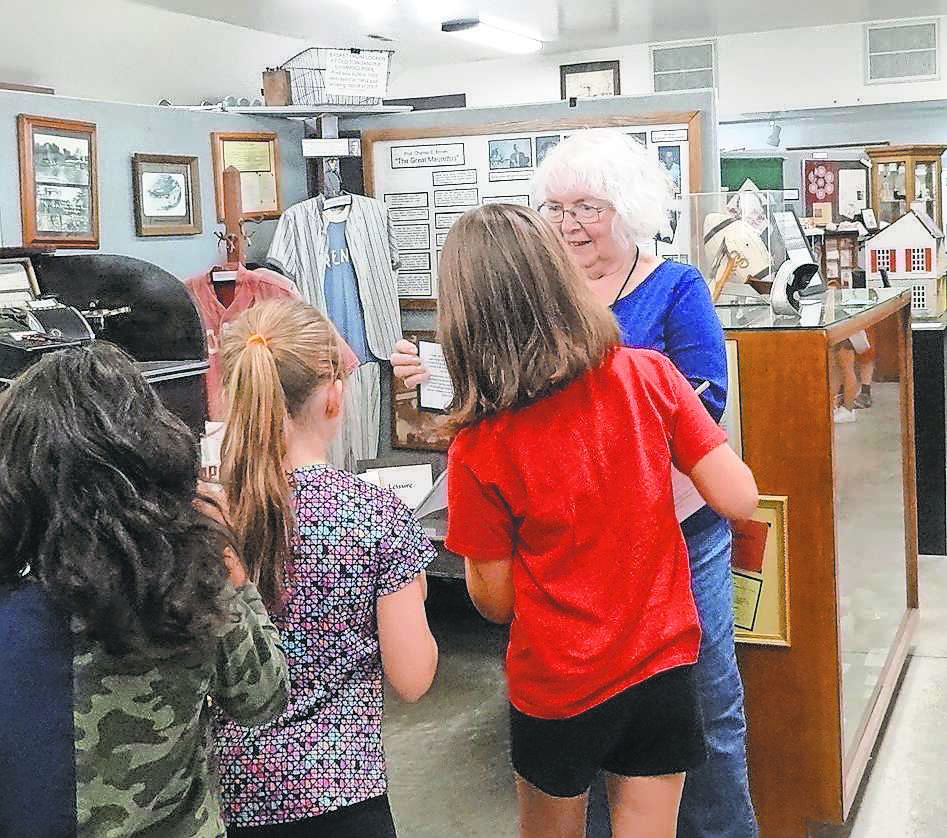 Tonganoxie Community Historical Society volunteers Rose Mangan explains items inside the TCHS museum to Tonganoxie Elementary School third-graders Monday as part of the class’ annual field trip to the TCHS campus.
