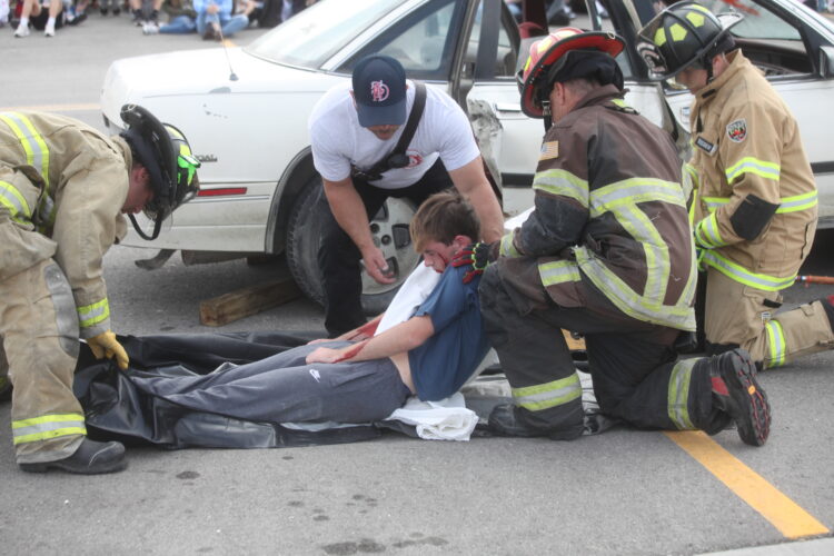 Tonganoxie City Fire Department members assist a Tonganoxie High School student during a mock crash Thursday on the access road on the THS campus.Tonganoxie High School Family, Career and Community Leaders of America and THS Students Against Destructive Decisions organized the annual mock crash on the THS campus.