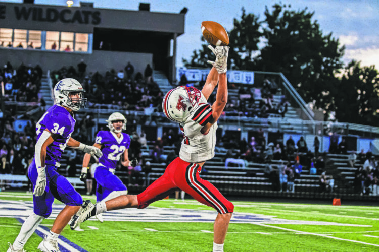 Tonganoxie High’s Todd Brown goes up for the ball Friday against Louisburg at Wildcat Stadium in Louisburg. LHS handed Tonganoxie its first Frontier League loss with a 49-0 shutout. Tonganoxie (3-1 in Frontier League play and 3-3 overall) faces league leader Eudora this coming Friday at EHS. The Cardinals are 4-1 and 5-1 with their only blemish coming in Week 5 in an overtime loss against Louisburg.