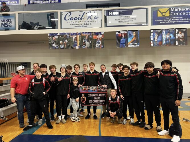 Tonganoxie High boys wrestling team members celebrate a regional title Saturday in Holton. The THS boys and girls teams will compete at the state championships Friday and Saturday at Tony’s Pizza Events Center in Salina.