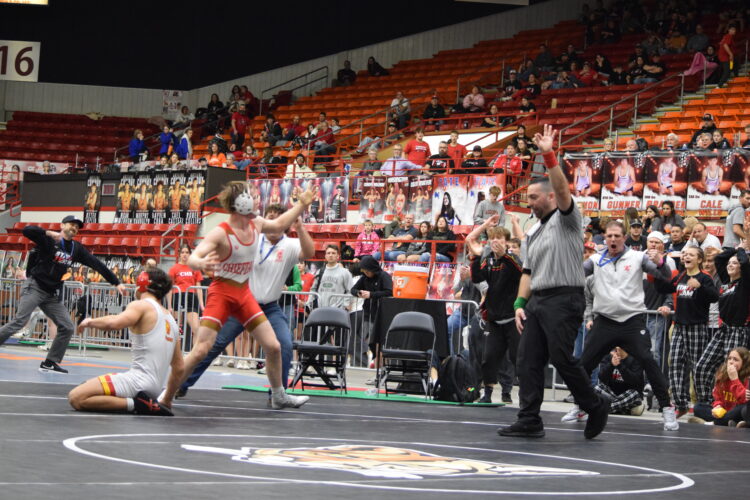 Tonganoxie High's Clayton Crookham reacts to winning his semifinal match in overtime Saturday against Columbus' Jayden Rodriguez at Tony's Pizza Events Center in Salina. Crookham won by sudden victory and advanced to the finals.The Tonganoxie High boys wrestling team has three state qualifiers preparing to wrestle in the championship finals and another five guaranteed to place Saturday at the 4A championships at Tony’s Pizza Events Center in Salina.